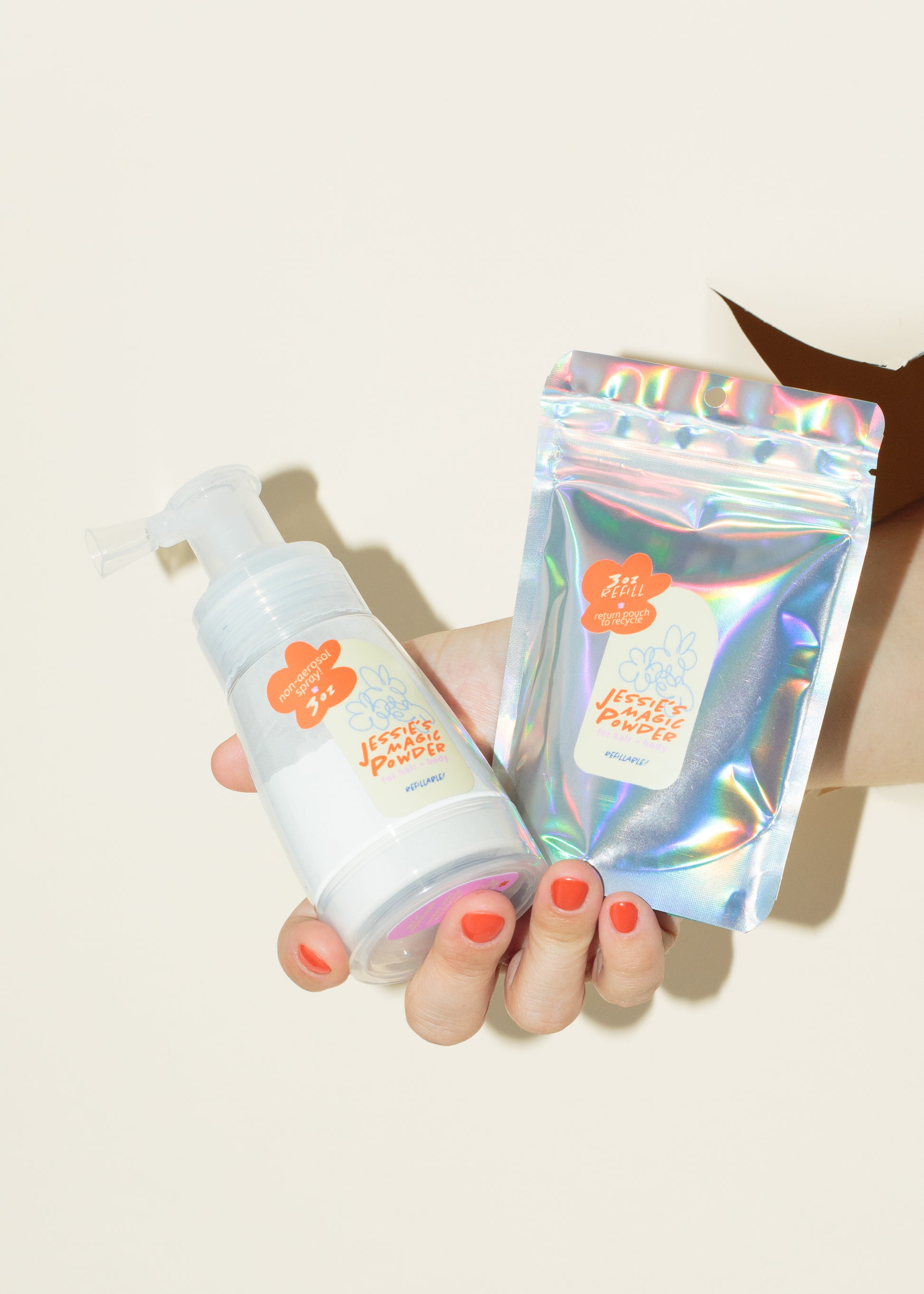 Jessie's Magic Powder (for hair and body) is the powder that absorbs it all! Created with everyone in mind, this 2-in-1 dry shampoo and body powder is the one to try when you've tried as many as we have (a lot). Our silky and translucent formula made from all natural finely-milled powders is as effective as it is uncomplicated. With the perfect balance of 3 simple ingredients, we've found a powder that's, well, for a lack of a better word, magic!